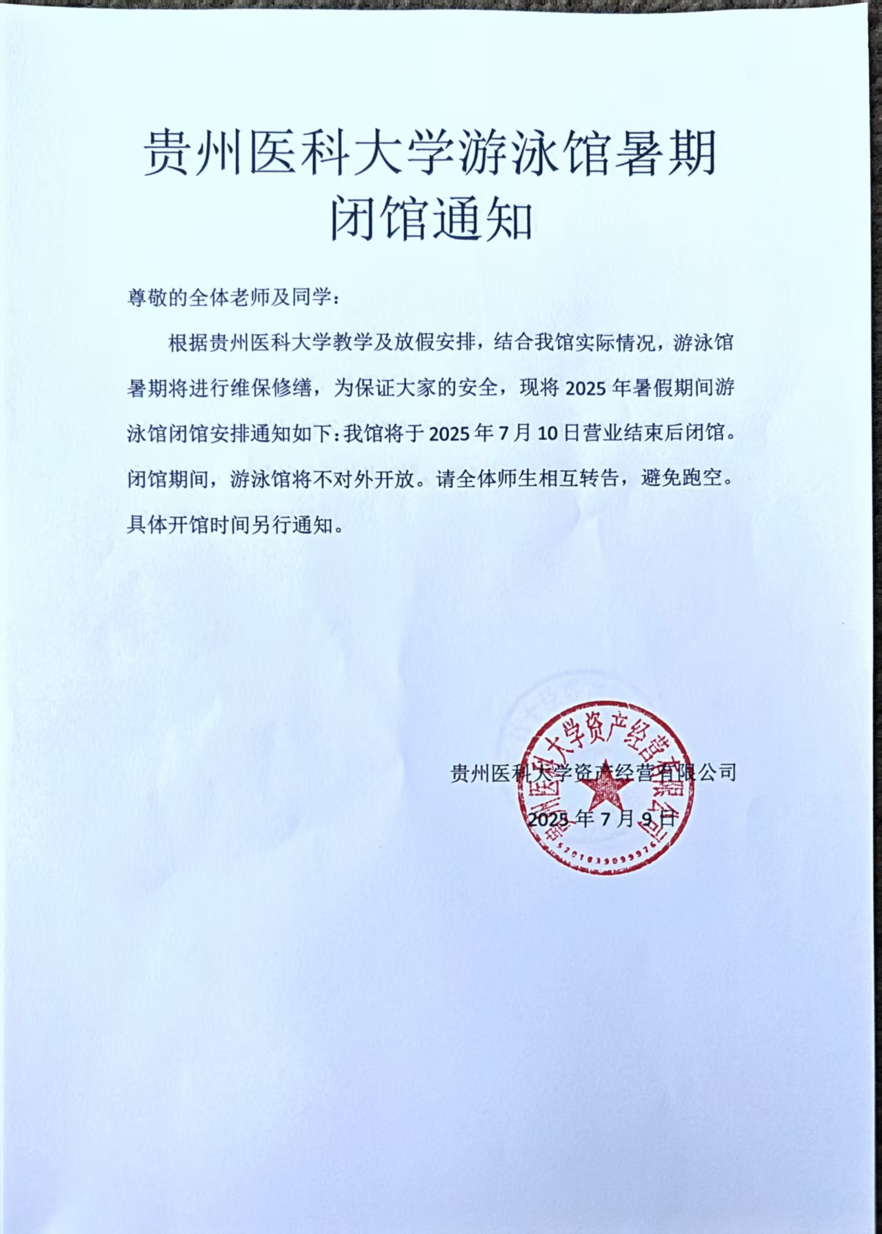 贵州医科大学游泳馆暑期闭馆通知